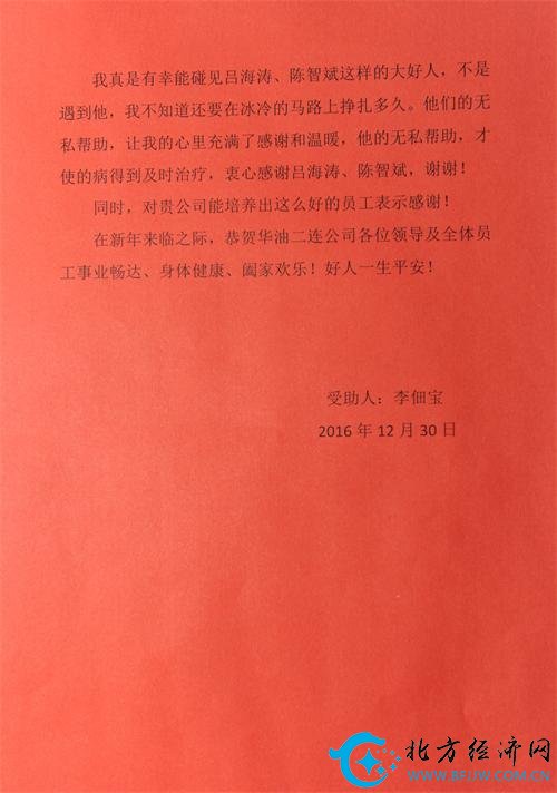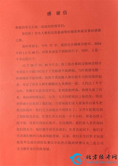 老人的儿子几经转辗终于打听到施救的人是分公司消防支队赛汉中队员工吕海涛和宝力格采油作业区员工陈智斌。事后,老人托子女饱含深情的将感谢信和锦旗送到单位,再次感谢救助过他的友善的石油员工。