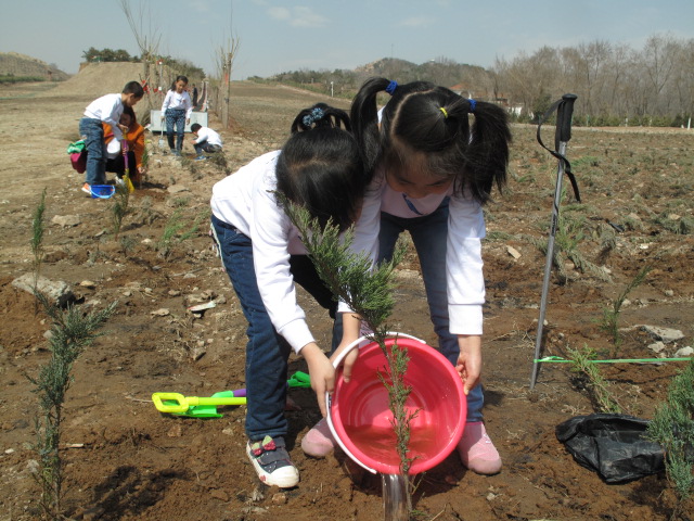 当日上午9时许,呼市回民区蒲公英幼儿园等学校的100余名学生,在家长、老师和社会爱心人士的陪同下,来到大青山南坡乌素图森林公园,在家长、老师的指导下,小朋友们用小锹挖坑、培土,用小水桶浇水,干得不亦乐乎。